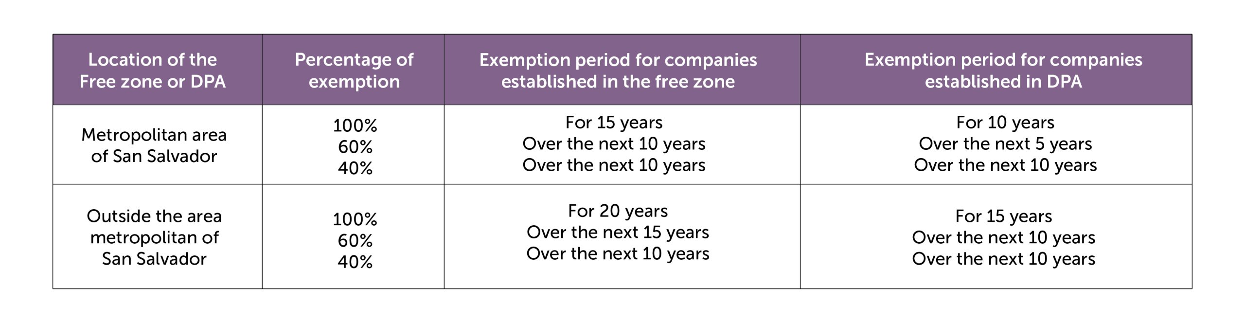 - Legal and tax stability, with a stable political environment and the option of legal stability contracts for up to 20 years with investments exceeding USD 15.4 million in fixed assets.